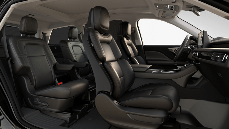 Black Metallic 2025 Lincoln Aviator Reserve AWD 10-Speed Automatic 3.0L V6 14 Speakers, 30-Way Perfect Position Seats w/Active Motion, 3rd row seats: split-bench, 4-Wheel Disc Brakes, 40/Mini Console/40 Dual Captain's Chairs, ABS brakes, Adaptive Dynamic Bending Lighting, Adaptive Pixel LED Headlamps, Adaptive suspension, Advanced Heads-Up Display, Air Conditioning, Air Glide Suspension w/Dynamic Lower Entry, Alloy wheels, AM/FM radio: SiriusXM, Apple CarPlay/Android Auto, Audio memory, Auto Air Refresh, Auto High-beam Headlights, Auto-dimming door mirrors, Auto-dimming Rear-View mirror, Automatic temperature control, Brake assist, Bumpers: body-color, Compass, Delay-off headlights, Driver door bin, Driver vanity mirror, Dual front impact airbags, Dual front side impact airbags, Dynamic Handling Package, Electronic Stability Control, Emergency communication system: 911 Assist, Equipment Group 201A, Four wheel independent suspension, Front anti-roll bar, Front Bucket Seats, Front Center Armrest, Front dual zone A/C, Front License Plate Bracket, Front reading lights, Fully automatic headlights, Garage door transmitter, Genuine wood console insert, Genuine wood dashboard insert, Heads-Up Display, Heated & Ventilated Rear Seats, Heated door mirrors, Heated front seats, Heated steering wheel, HVAC memory, Illuminated entry, Illuminated Lincoln Star in Grille, Illumination Package, Knee airbag, Leather steering wheel, Lincoln BlueCruise Equipped (4-Years Included), Lincoln Digital Experience, Lincoln Dynamic Signature Lighting, Low tire pressure warning, Luxury Package, Memory seat, Navigation system: Connected Navigation (1-year trial), Occupant sensing airbag, Outside temperature display, Overhead airbag, Overhead console, Panic alarm, Passenger door bin, Passenger vanity mirror, Power door mirrors, Power driver seat, Power Liftgate, Power moonroof: Panoramic Vista Roof, Power passenger seat, Power steering, Power windows, Premium Lthr Heated/Ventilated Fnt Captain's Chairs, Radio data system, Radio: Revel Audio System w/14 Speakers, Radio: Revel Ultima 3D Audio System w/28 Speakers, Rain sensing wipers, Rear air conditioning, Rear anti-roll bar, Rear audio controls, Rear dual zone A/C, Rear reading lights, Rear window defroster, Rear window wiper, Remote keyless entry, Security system, SiriusXM, Speed control, Speed Dependent Lighting, Speed-Sensitive Wipers, Split folding rear seat, Spoiler, Steering wheel memory, Steering wheel mounted A/C controls, Steering wheel mounted audio controls, Tachometer, Telescoping steering wheel, Tilt steering wheel, Traction control, Trip computer, Turn signal indicator mirrors, Variably intermittent wipers, Ventilated front seats, Wheels: 21 Bright-Machined Aluminum, Wheels: 22 Bright-Machined Aluminum, Wireless Charging Pad.